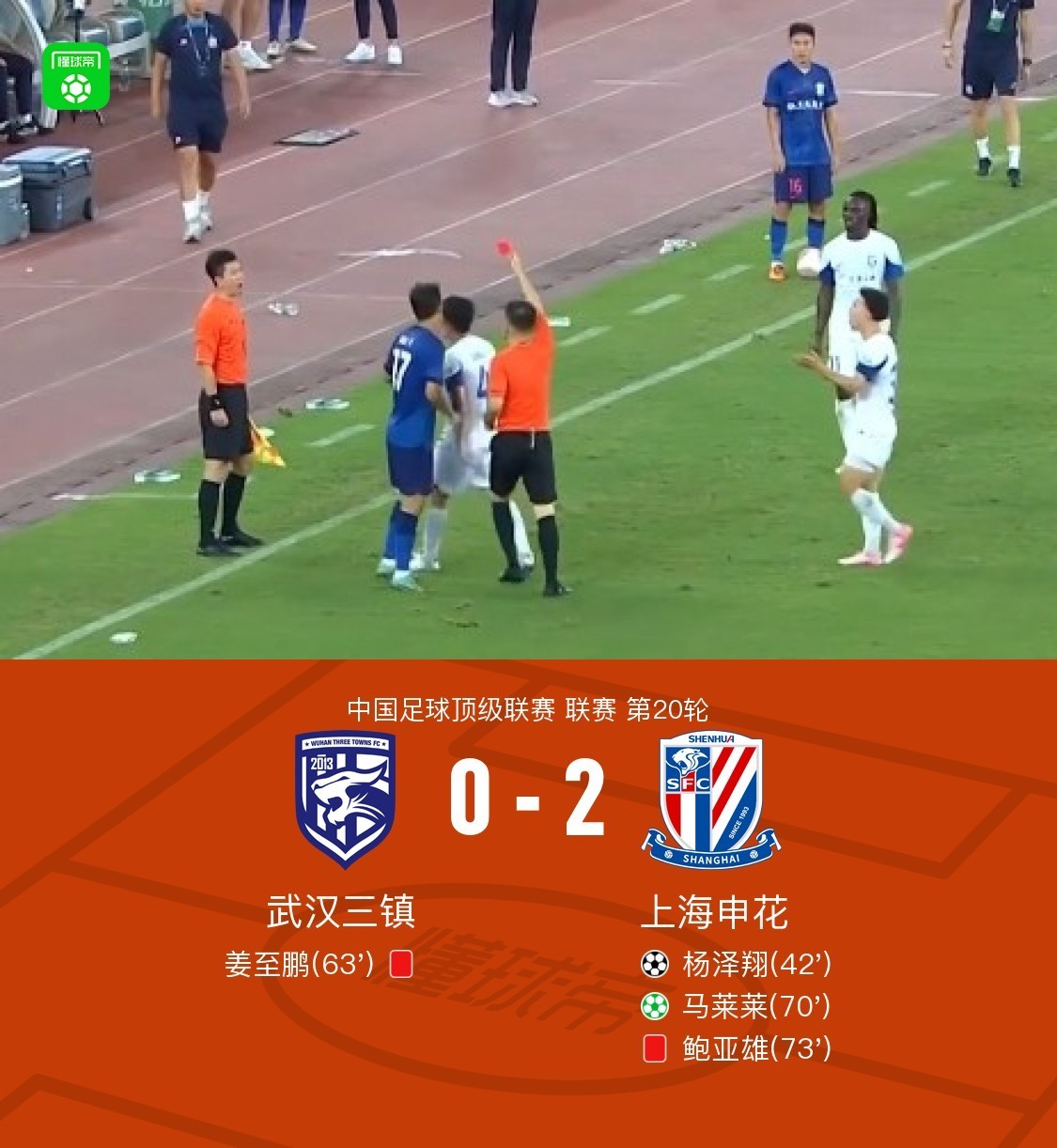 在中国足球顶级联赛第20轮的比赛中,武汉三镇主场迎战上海申花。比赛中,上海申花的徐皓阳助攻杨泽翔,成功打入一球。随后,武汉三镇的姜至鹏被罚下场。上海申花的马莱莱通过点球再下一城。比赛后期,上海申花的鲍亚雄也被罚下场。最终,上海申花以2比0战胜武汉三镇。