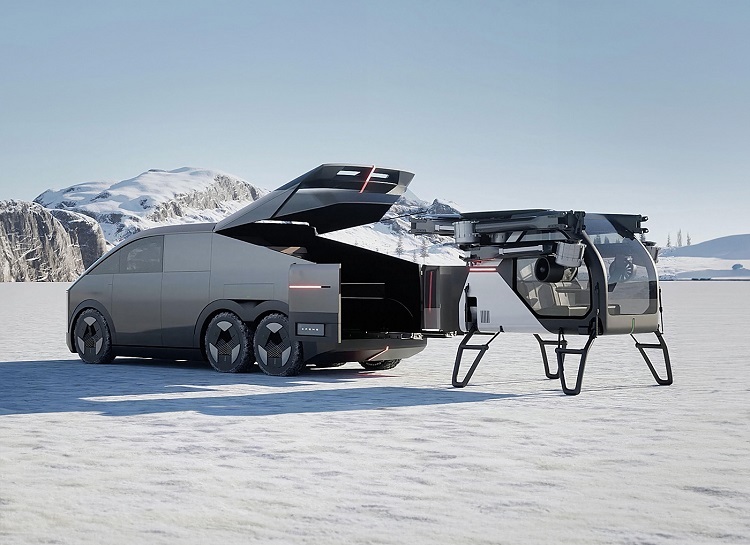 这款陆地航母的设计初衷是为了能在后备箱中塞下一款载人飞行汽车,在原本的设计图上,它由陆行体和飞行体两个部分组成,并且飞行体可以完全收纳入陆行体内部,并进行地面移动和自动分离等操作。