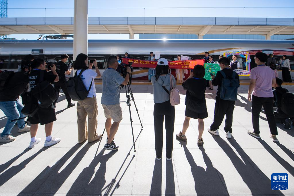 7月30日,参与杭温高铁首次试运行的媒体在桐庐东站站台上采访。