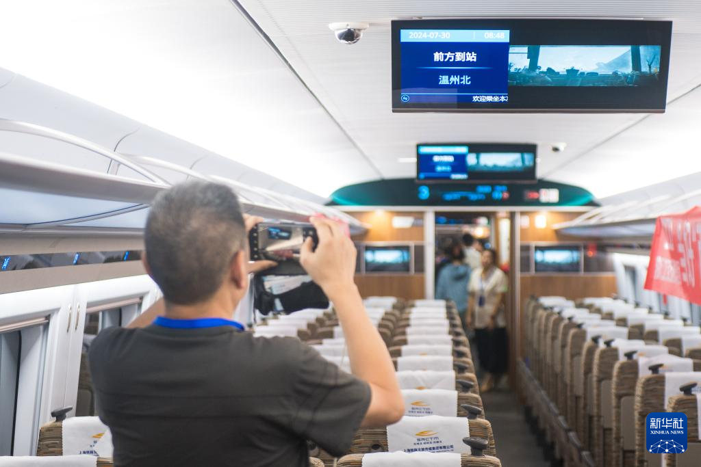 7月30日,参与杭温高铁首次试运行的乘客在高铁车厢内拍摄电子显示屏。
