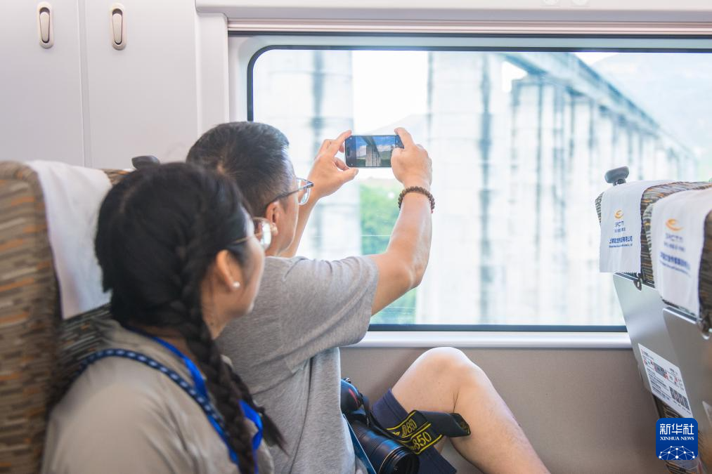 7月30日,参与杭温高铁首次试运行的乘客在旅途中拍摄杭温高铁沿途风景。