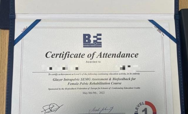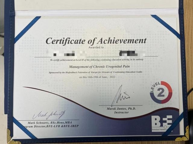 2、欧洲盆底生物反馈协会1级、2级证——旨在通过促进盆底肌肉的修复和再生,改善产后女性盆底健康状况,减少漏尿。恢复到最佳状态!