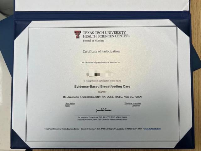 1、德克萨斯州理工大学母乳喂养证、泌乳支持人员专业培训课程学分——对于新妈妈来说,哺乳问题可能是最大的难题之一,有了这张证书,意味着我们的护士能够提供zui专业的指导~他们会从生理、心理等相关方面通过评估,再沟通指导、辅助手法等技术和方法,解决哺乳期乳少、乳汁淤积、乳头疼痛皲裂及宝宝拒乳等问题,并进行泌乳策略指导和宣教。