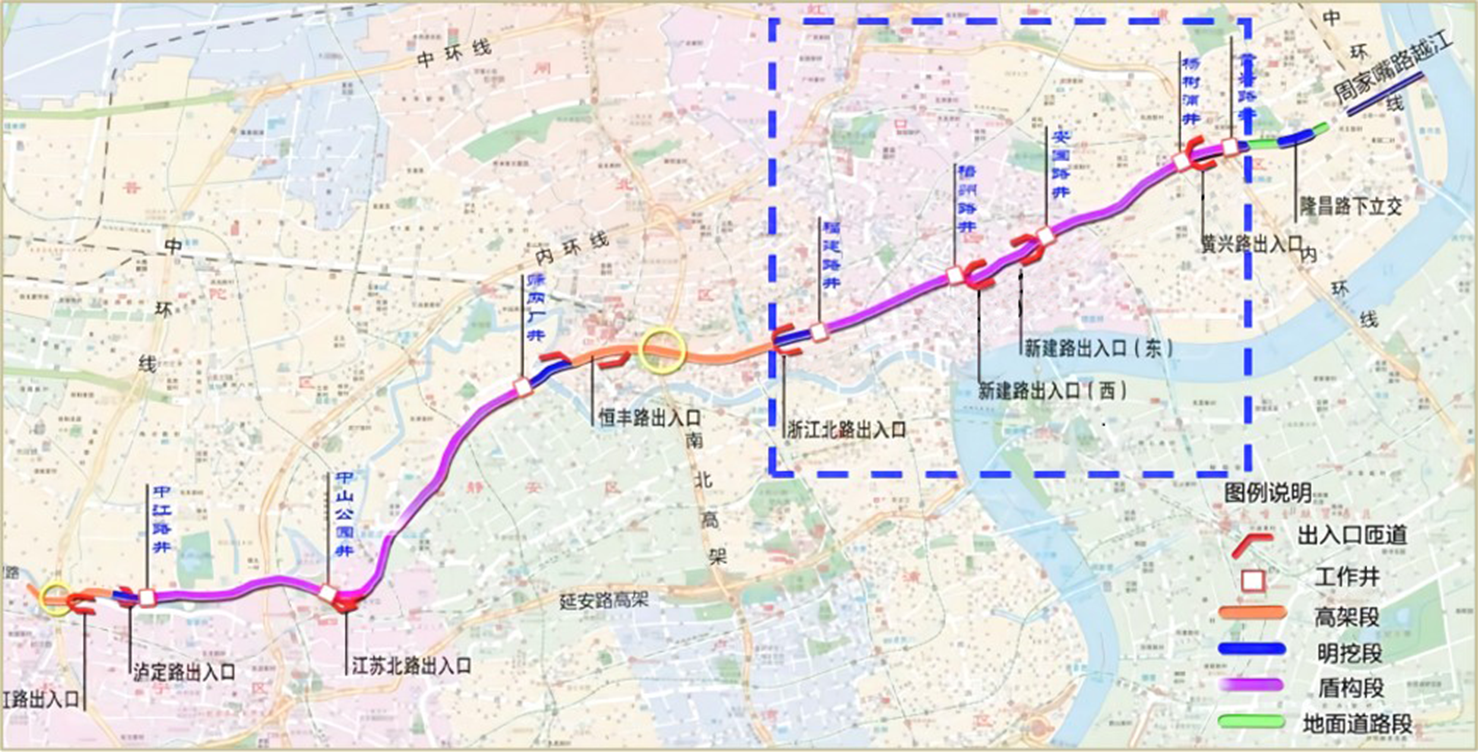 北横通道西起中环北虹路立交,东至周家嘴路内江路交叉口,全长约19.1公里。北横通道主线采用城市主干路设计标准,双向4车道+两侧应急车道或集散车道的建设规模,设计时速60公里,限高3米。北横通道西段(北虹立交-热河路)已于2021年6月通车,此次通车的东段西起天目立交文安路接地点,与已通车的西段相连;东至周家嘴路、内江路,全长约8.2公里;自西向东设新建路、公平路、黄兴路3对进出口匝道及双阳路1对接地匝道。北横通道全线通车后,往西可以直达虹桥枢纽,往东可以经由周家嘴路隧道到达浦东新区,对提升区域交通出行环境、分流过境交通、缓解地面交通压力等方面具有重要作用。