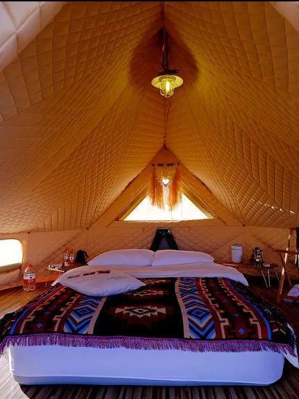 星空房采用模块化分片设计,连接方式为螺栓拼接,实现了密不透风。而且,为了增强星空房的遮阳效果,在星空房外部特意安装了PE材料,做到了传统与现代、复古与时尚的有机结合。房内还配有独立卫生间及淋浴设施,床品为无印良品标配。