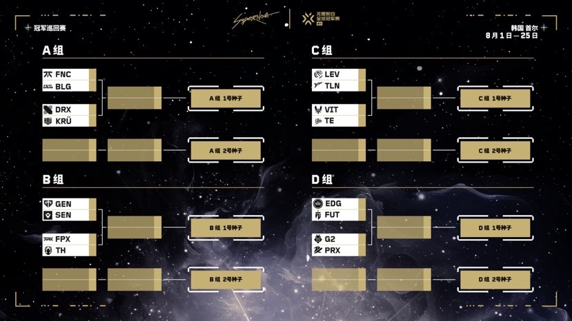 这些队伍分别是中国赛区的EDG、FPX、TE、BLG,太平洋赛区的PRX、GEN、DRX、TLN,EMEA(欧洲、中东及非洲)赛区的FNC、VIT、TH、FUT以及美洲赛区的LEV、G2、SEN、KRU。