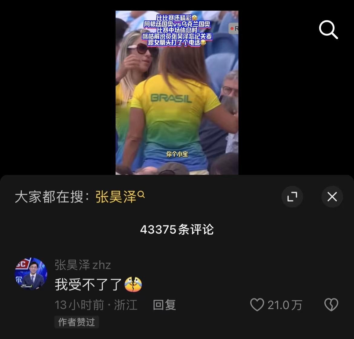 事后,张昊泽本人在相关视频评论区回复“我受不了了”,并配上裂开流泪的表情包。