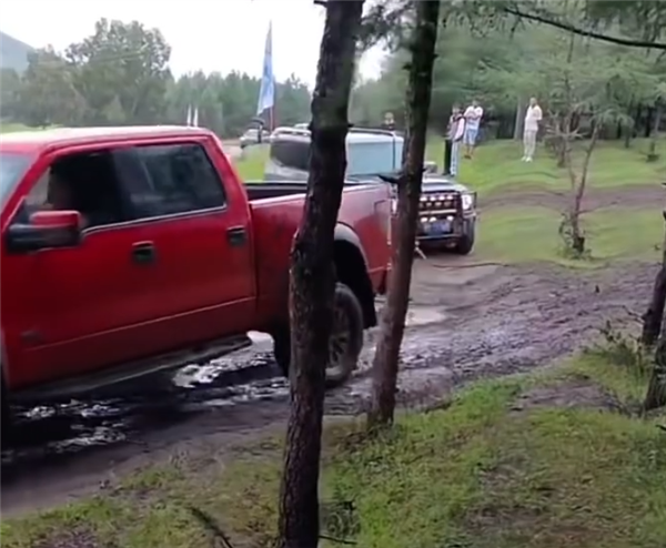 在救援绳索将两车绑定后,福特猛禽一脚油门冲了出来,巨大的拖拽力将猛禽的车尾拉扯到了右方道路。
