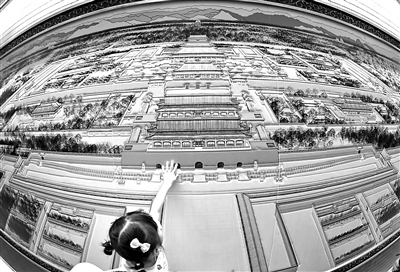 其中,“光影中轴:纵览风光千般景”中充分利用了数字化大屏介绍中轴线遗产点位。北青报记者体验发现,随着记者的手指触摸,大屏幕从北到南迭次展示出中轴线遗产点位的数字影像,观众面向大屏幕,仿佛从上空俯瞰中轴线,中轴线上遗产定位一目了然,时空关系也十分清晰。