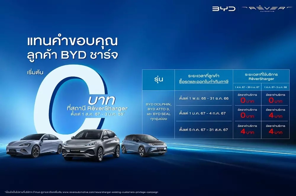 Rever 网站今日还发布了一则公告,为了感谢比亚迪客户,从 2024 年 8 月 1 日上午 8:00 至 2025 年 1 月 3 日晚 11:59,RêverSharger 充电站的充电费用为 0 泰铢起。