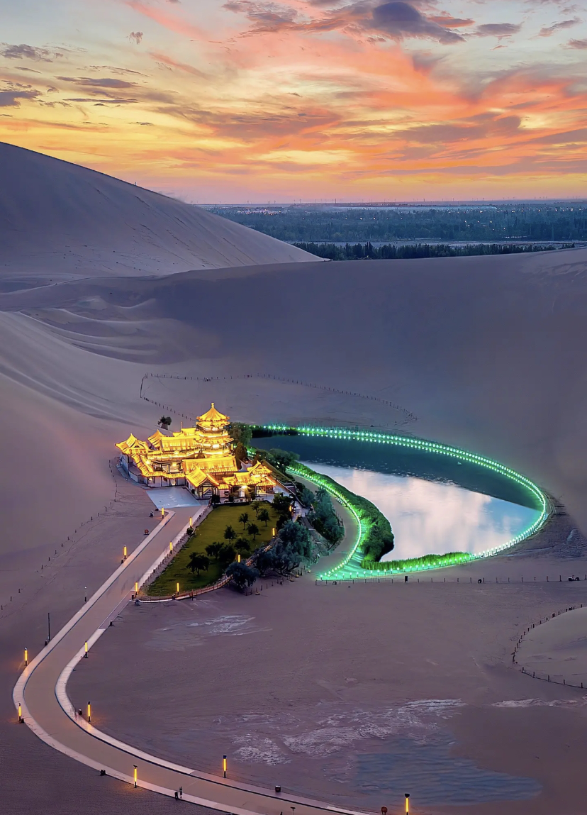 今年的鸣沙山月牙泉万人演唱会已经开始啦!在日落前进入景区,慢慢爬上沙丘欣赏大漠日落,之后就可以等待夜幕降临沉浸式感受万人演唱会了