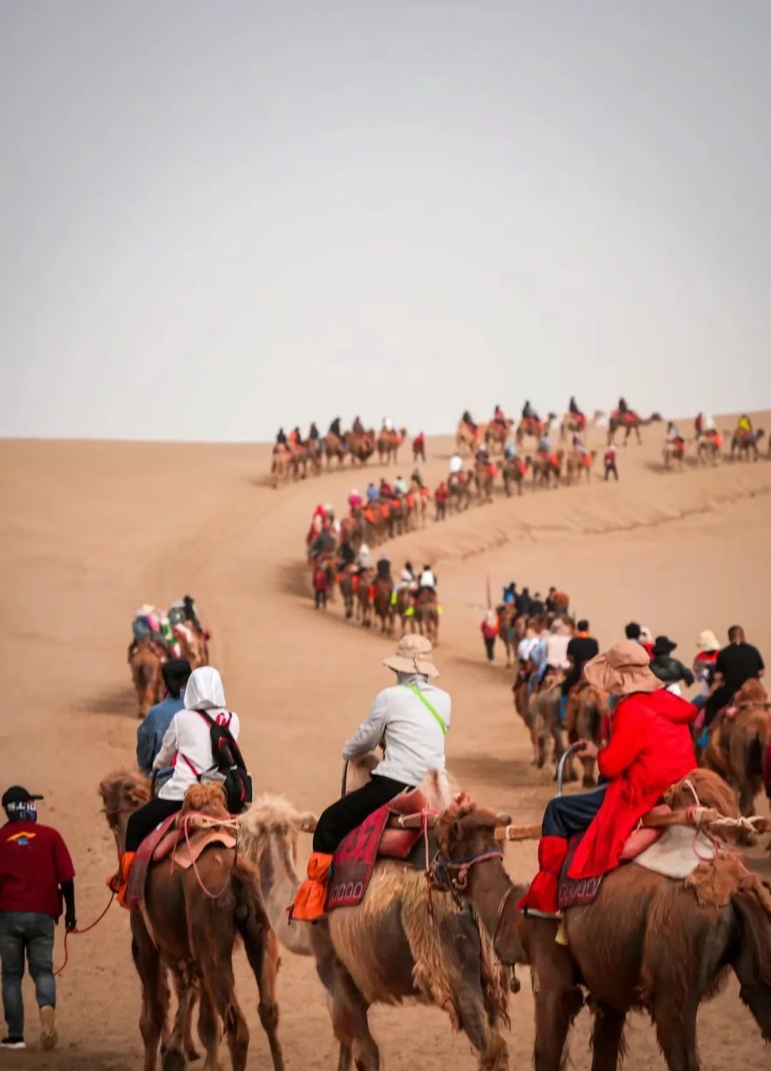 鸣沙山游览时请做好防晒工作,需穿平底鞋、旅游鞋或凉鞋;