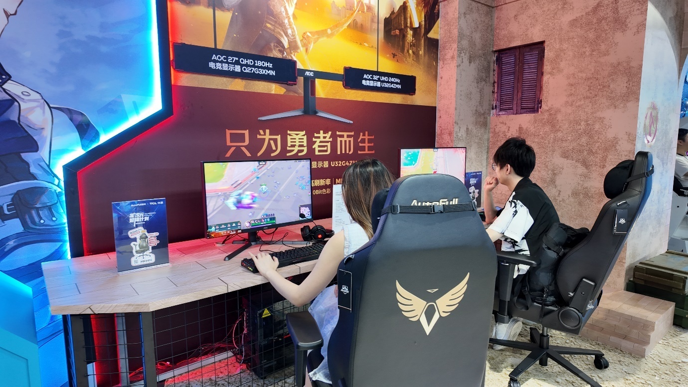 华星光电的游戏体验展区同样被傲风电竞椅“占领”,玩家们在这里既能体验到华星面板和AOC显示器带来的视觉盛宴,还能坐在傲风电竞椅上舒适游戏,游戏沉浸感拉满。