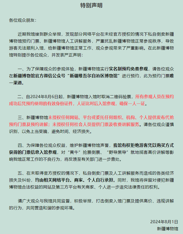 近期我馆接到群众举报,发现部分网络平台在未经官方授权的情况下私自倒卖新疆博物馆预约门票、新疆博物馆人工讲解服务,严重扰乱新疆博物馆正常参观秩序,导致游客无法顺利入馆,给新疆博物馆正常工作、观众参观带来了严重影响。在此新疆博物馆特别提示各位观众,并发表严正声明: