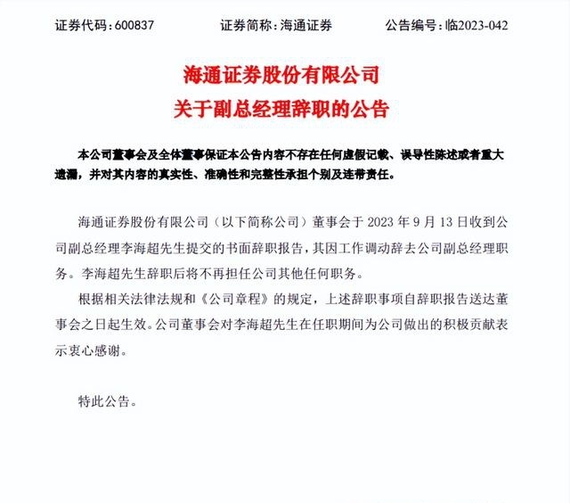 2023年9月,在时任副总经理李海超的辞职公告中,海通证券同样对其在任期期间为公司做出的积极贡献表示衷心感谢。