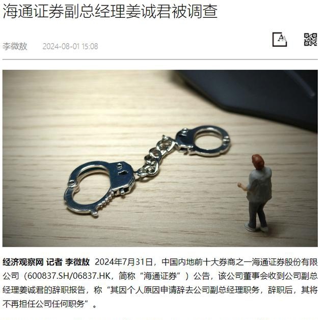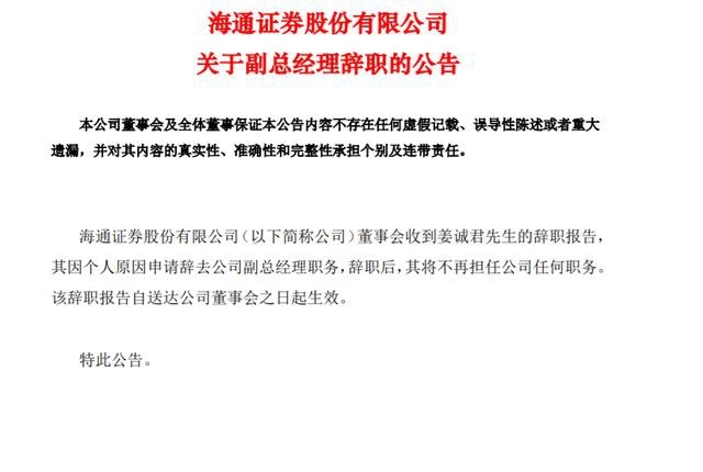 7月31日,海通证券公告显示,姜诚君因个人原因申请辞去公司副总经理职务,辞职后,将不再担任公司任何职务。