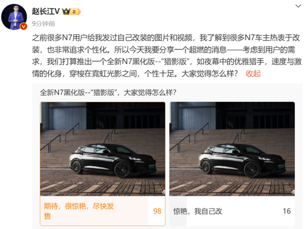 赵长江发文称:“之前很多N7用户给我发过自己改装的图片和视频,我了解到很多N7车主热衷于改装,也非常追求个性化。所以今天我要分享一个超燃的消息——考虑到用户的需求,我们打算推出一个全新N7黑化版——‘猎影版’,如夜幕中的优雅猎手,速度与激情的化身,穿梭在霓虹光影之间,个性十足。”根据其说法,腾势N7将会在近期推出一个新版本,主要在外观方面进行黑化处理,让车辆看上去更加帅气。而在发起的投票中,大部分人都对这款新车型充满期待,希望能够尽快推出。