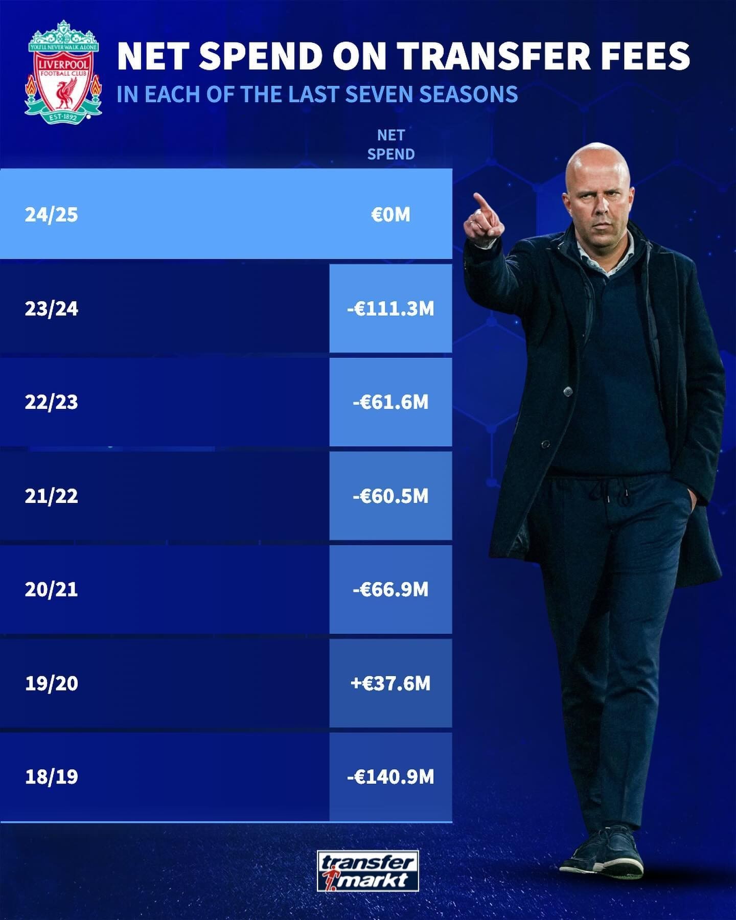 据德国转会市场网站统计,利物浦此前6个赛季有5个赛季净支出超过6000万欧,唯一盈利的赛季是2019-20赛季英超夺冠赛季。