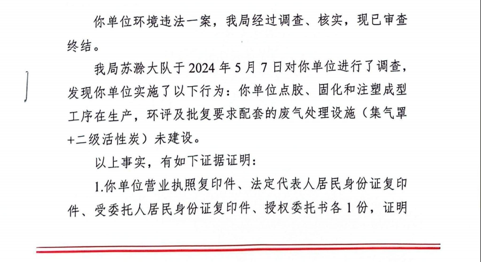 公开处罚信息显示,滁州市生态环境局苏滁大队于2024年5月7日对该公司进行了调查, 发现你单位实施了以下行为:你单位点胶、固化和注塑成型工序在生产,环评及批复要求配套的废气处理设施(集气罩 +二级活性炭)未建设。
