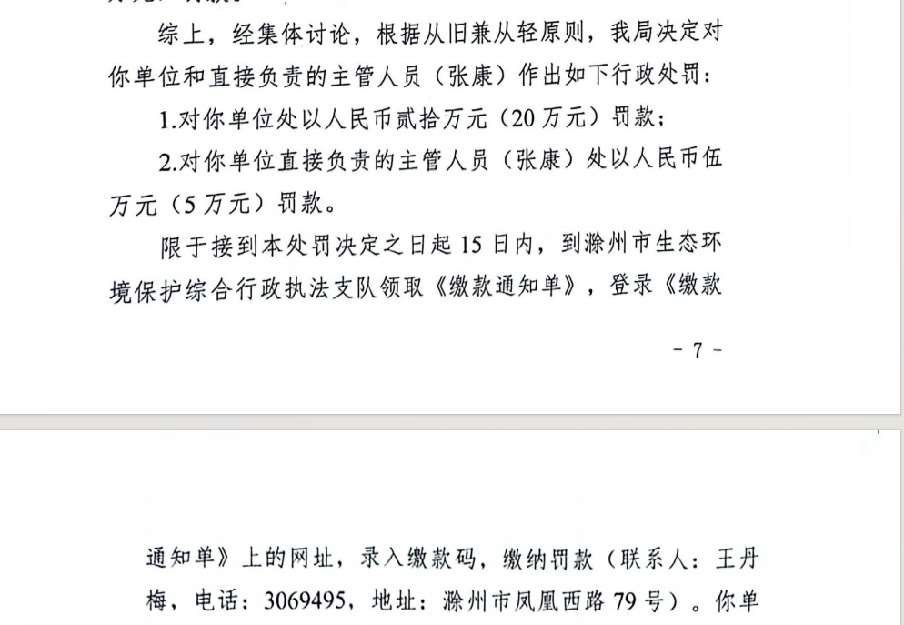 依据相关法律法规,滁州市生态环境局决定对安徽康耐盛电子科技有限公司处以人民币贰拾万元(20万元)罚款,同时对该公司直接负责的主管人员(张康)处以人民币伍 万元(5万元)罚款。