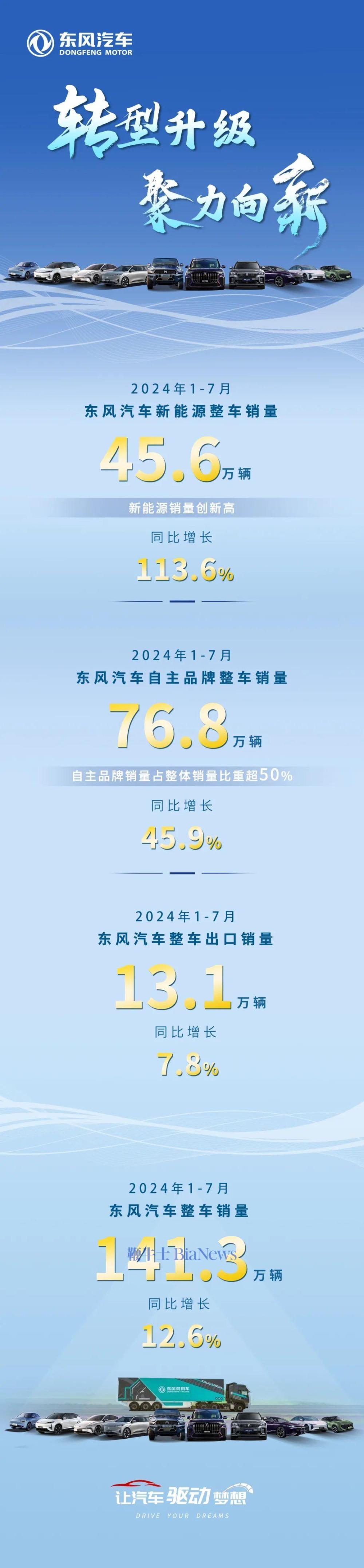 鞭牛士 8月2日消息,东风汽车宣布,2024年1-7月,东风汽车整车销量141.3万辆,同比增长12.6%;东风汽车新能源整车销量45.6万辆,同比增长113.6%;东风汽车自主品牌整车销量76.8万辆,同比增长45.9%;东风汽车整车出口销量13.1万辆,同比增长7.8%。