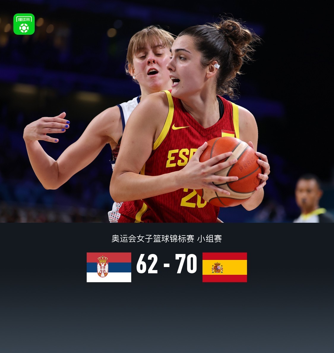 第四节塞尔维亚女篮伊冯娜-安德森拿下11分,西班牙女篮保拉-金佐拿下6分,最终塞尔维亚女篮62-70不敌西班牙女篮