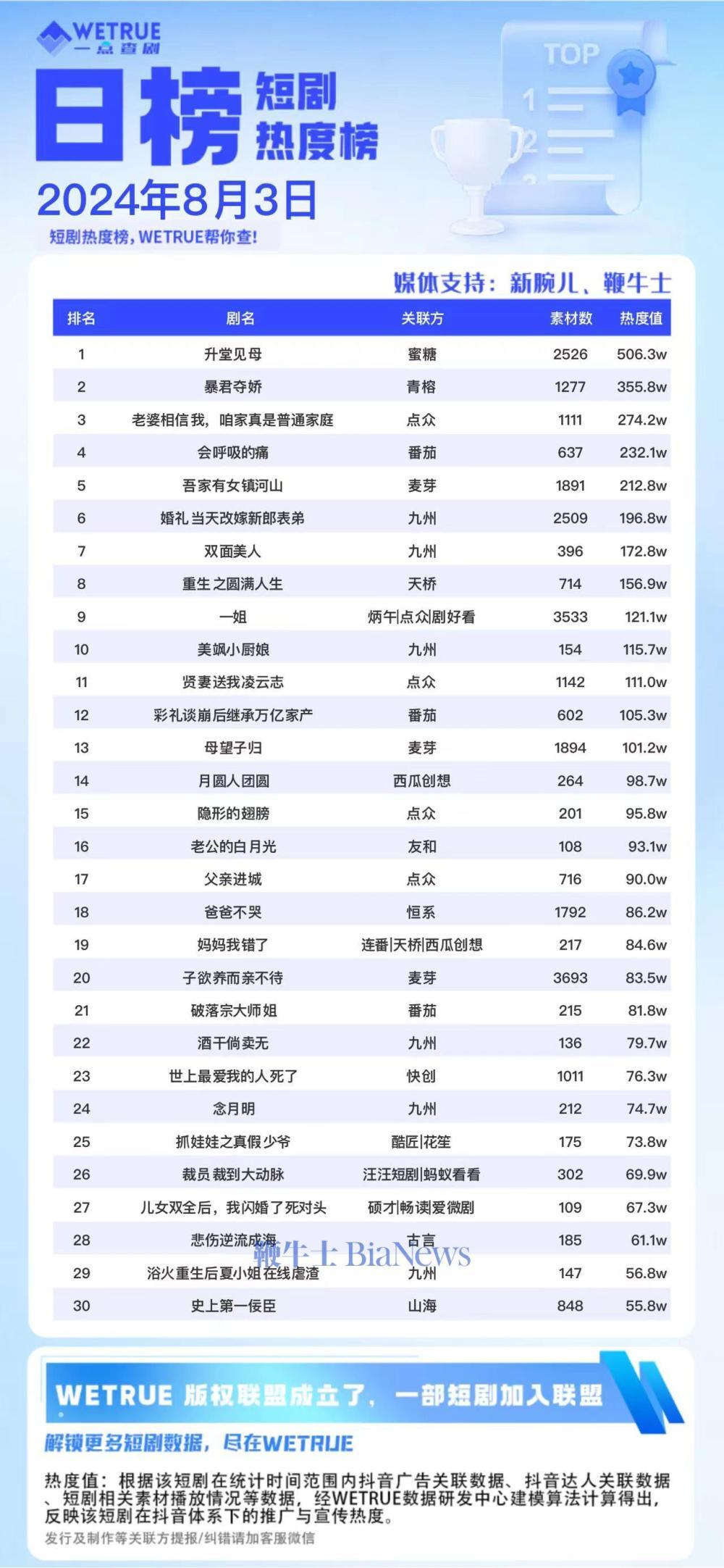 编者按:为帮助短剧从业者提供更多信息,专注于短剧报道的新腕儿和科技媒体鞭牛士联合WETRUE短剧热度榜共同推出短剧热度榜。