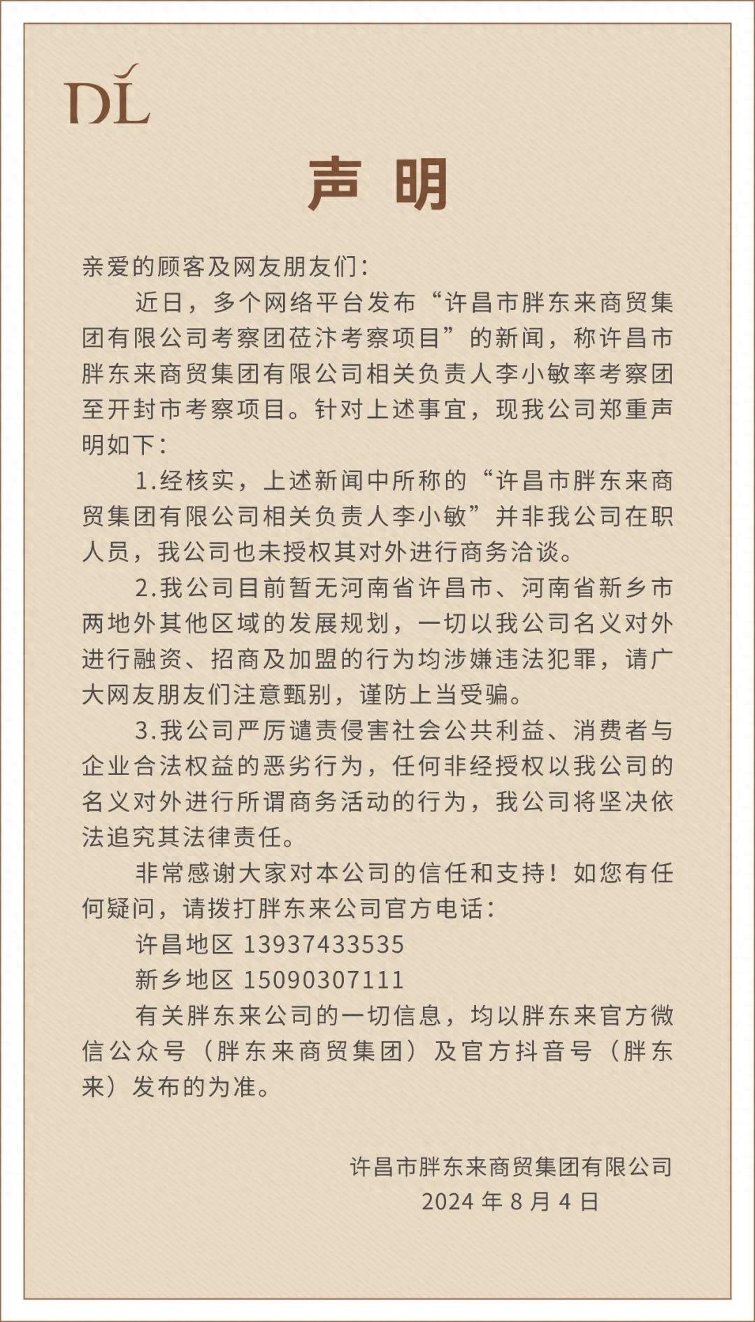 8月4日,胖东来商贸集团发声明称,“许昌市胖东来商贸集团有限公司相关负责人李小敏”并非我公司在职人员,我公司也未授权其对外进行商务洽谈。