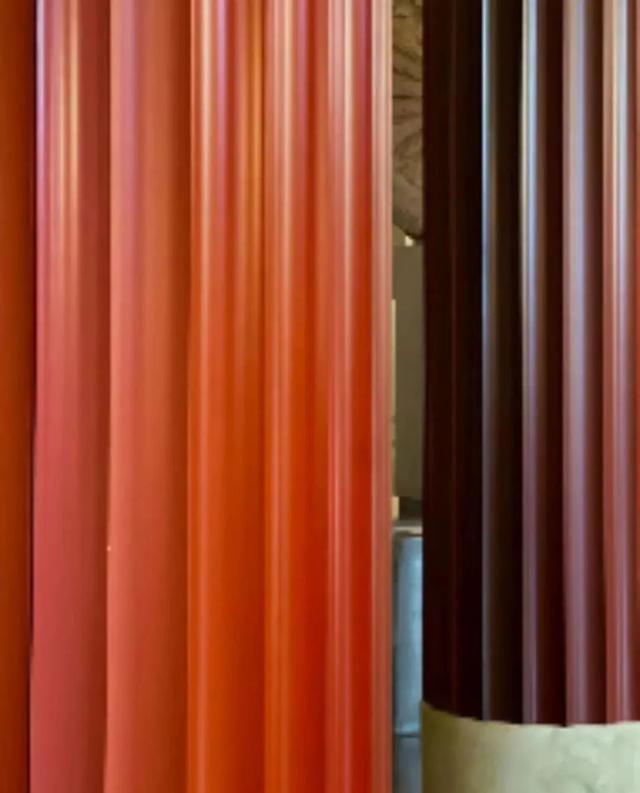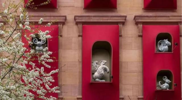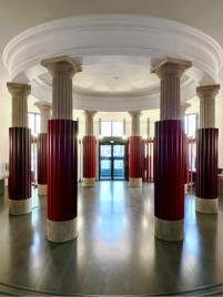 在入口处的圆形大厅中,石柱被渐变的红色环绕,色彩在空间里移动、跳跃、舞蹈,如诗,如歌,每一刻都是不同的。而这些深浅变幻的红色都源于中国,色调或热烈或深沉,象征着庆典与祈福,承载着特殊象征,传递着诗意共鸣,与博物馆内百年的历史石柱相得益彰,更添华彩。
