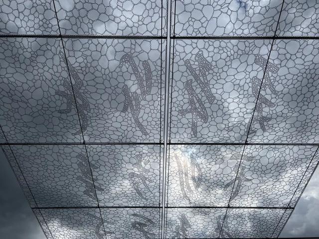 在吉美博物馆的露台花园,一件大型装置作品《AI女书2024/勇敢》铺展开来,在这张巨大的“网”上绣着六十位中国女性关于“勇敢”的集体声音与故事。蒋琼耳受中国历史“女书”的启发,创作演绎了AI时代的新女书。