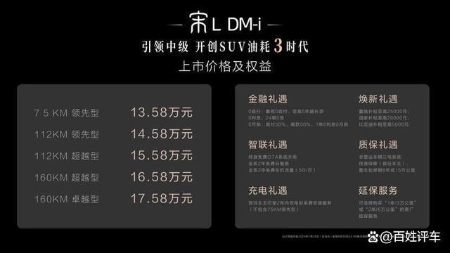 比亚迪宋L DM-i 不仅拥有很高的颜值,而且整车的智能化程度以及售价的斟酌上,都做得面面俱到。凭借比亚迪第五代DM技术的优势,全方位引领中级SUV并刷新大众对于中级SUV消费体验,颠覆用户对中级SUV的油耗续航认知,树立新价值标杆。为更多消费者带来绿色、智能、便捷的出行体验。