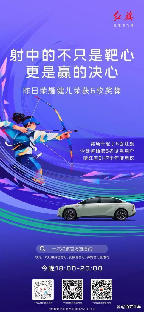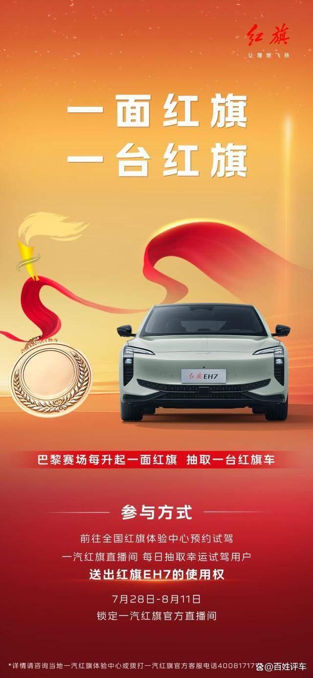 燃情巴黎,共庆高光!赛场上的荣耀仍在继续,“一汽红旗”官方直播间每晚7点如约开启的抽奖活动中,粉丝们的参与热情也在持续发酵。即日起至8月11日,粉丝用户前往中国内地(不含港澳台地区)的一汽红旗节能车体验中心、一汽红旗新能源体验中心或一汽红旗商超店进行试驾并录入试驾信息,就有机会成为下一批幸运“锦鲤”! 幸运之门只待轻轻一推,快快行动起来!