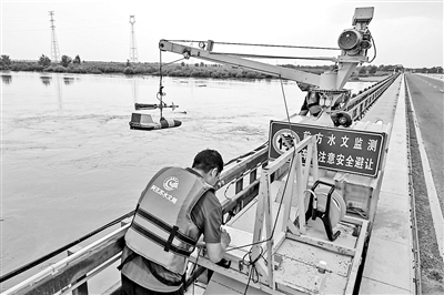 阿克苏水文勘测局工作人员在盖孜库木大桥防洪段收集水文信息