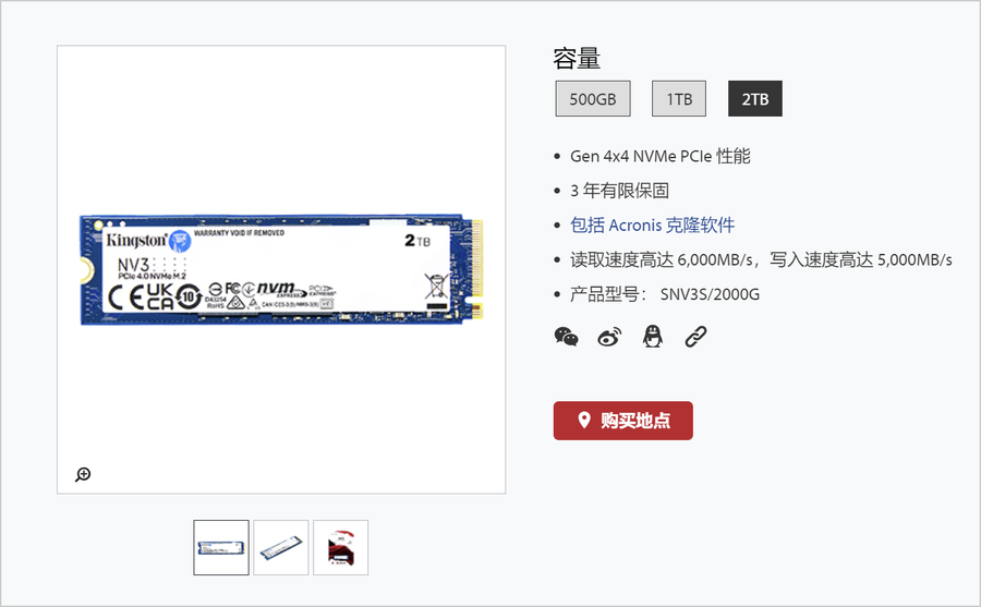 金士顿近期在其官方网站上面上架了NV3 PCIe 4.0固态硬盘,其采用标准的2280尺寸、M.2接口设计,至高连续读取速度可达6000MB/s,至高连续写入速度可达5000MB/s,属于主流定位的PCIe4.0固态硬盘。