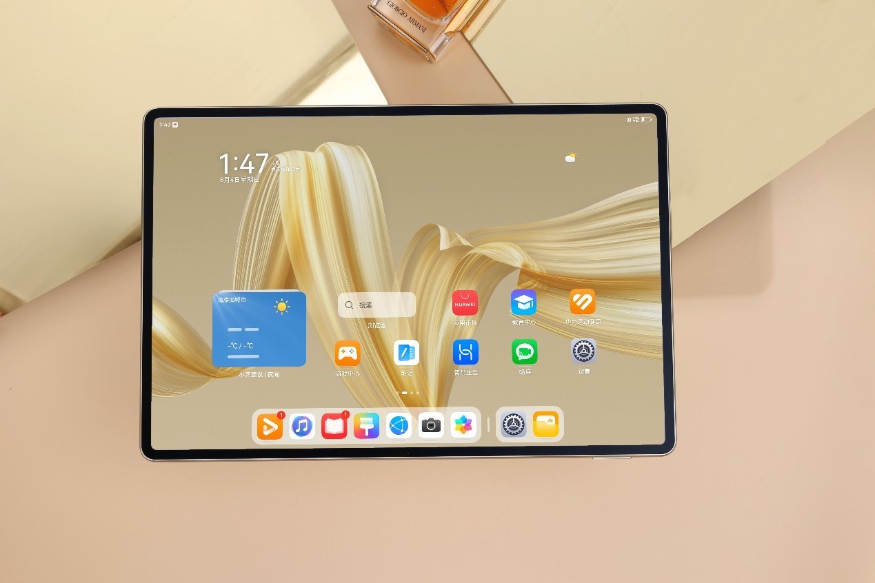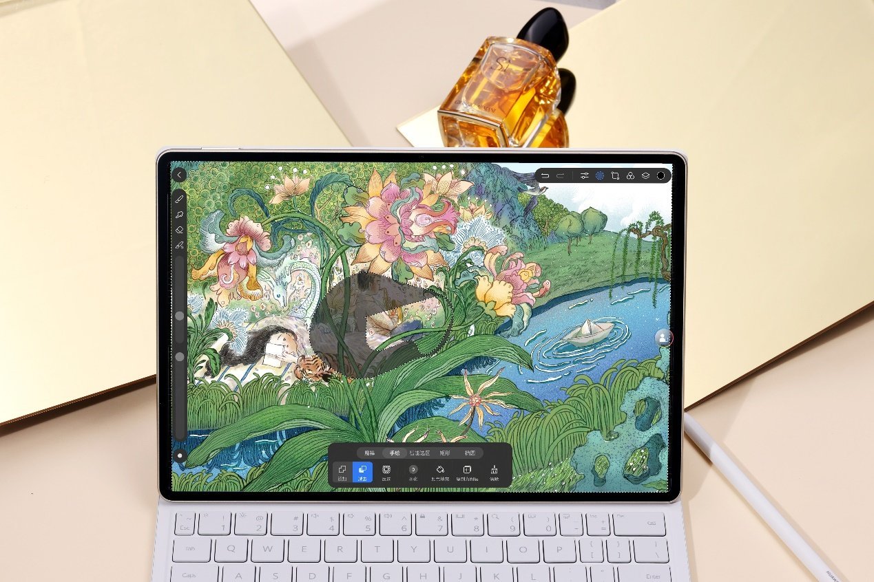 机身设计上,华为MatePad Pro 12.2英寸的后盖采用 0.5mm 航空级超薄玻纤材料,不仅让平板的重量控制在了5.5mm,还能带来更坚固的机身。全新「流金」配色的后盖通过油墨拓印、多重转印等工艺,还原出丝帛材质的流金视觉,摸上去还有丝帛的细腻触感,可以说是一上手便爱不释手。