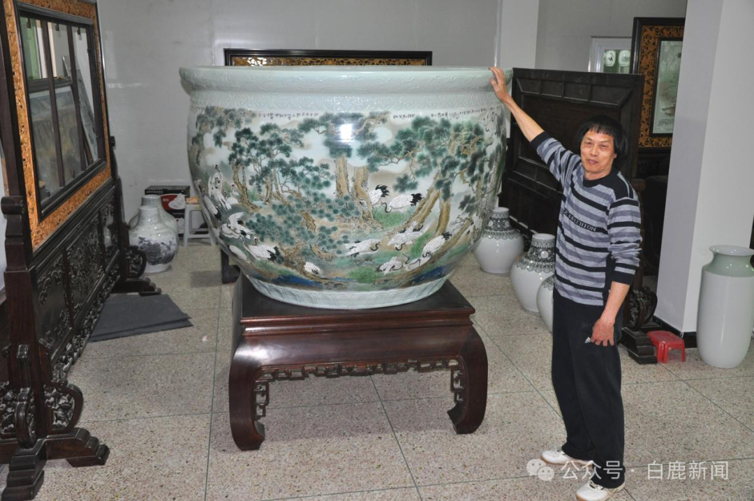 还有被称为中国最大的鱼缸——《松鹤图大鱼缸》,直径2.08米的百花百鸟大挂盘……这些大的作品气势磅礴,令人惊叹。其创作的难度,更是令人难以想象的。