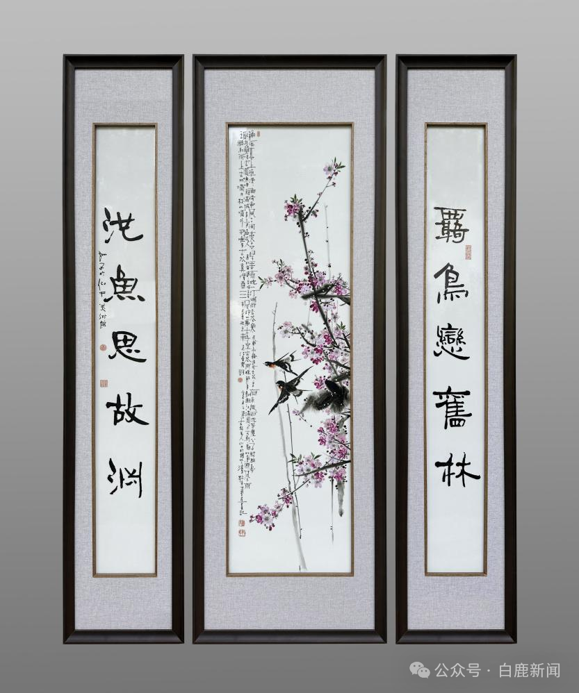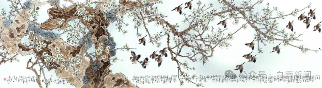 陈仰中大师的画与书法同样是相媲美的。他的瓷板画《香在笔墨中》,是香在书法中,这是一幅长横幅的梅雀图,梅花主干构成画帽主体,群雀聚散其间,还有点缀的点点白梅。整幅画是上满下空,于是陈仰中大师在2.4米的瓷板画下面题写了500多字。这书法质朴中含典丽,严谨中见洒脱,自然中有清奇,婉约中寓豪放,字里行间说着奔放的自由。