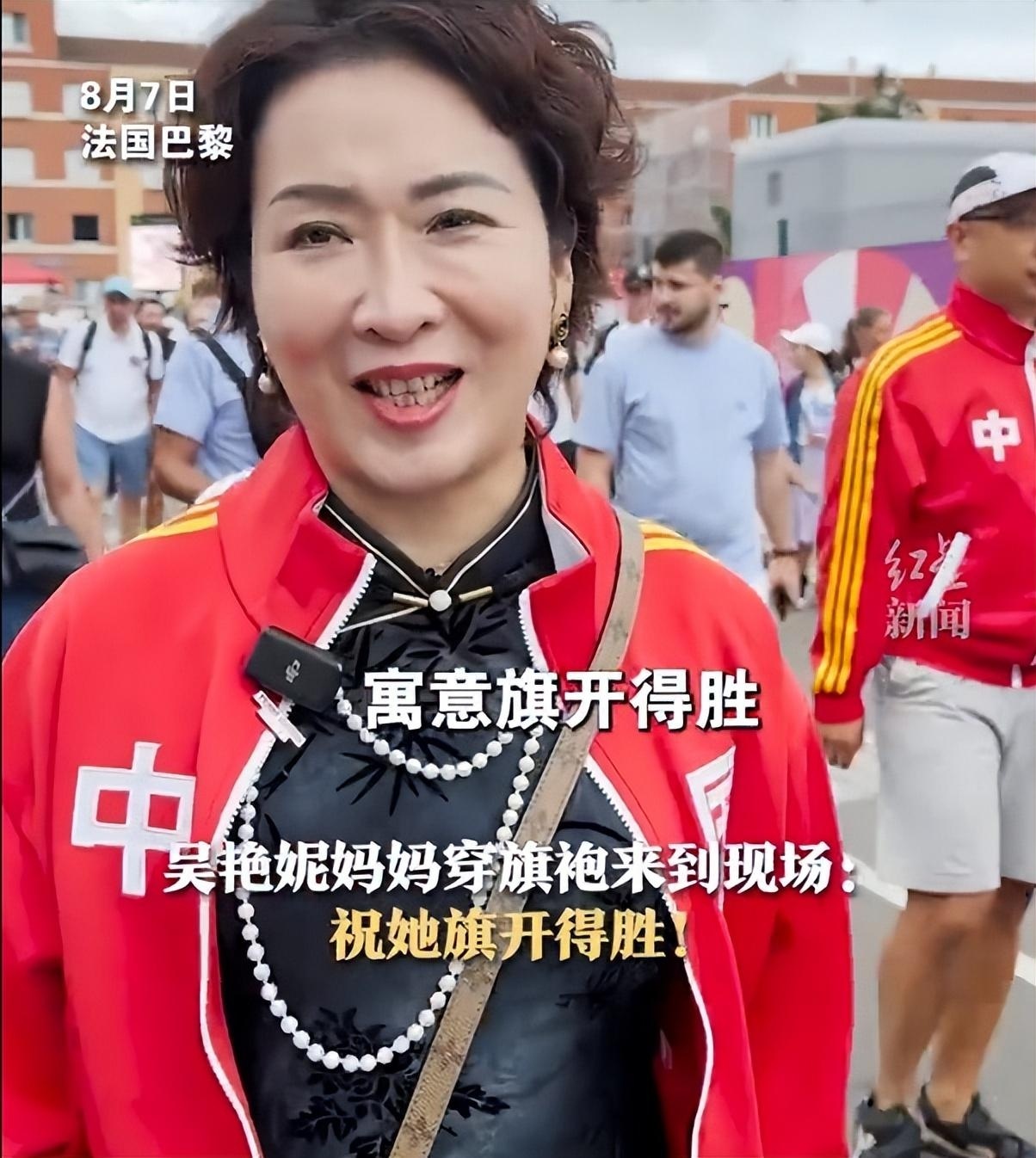 吴艳妮妈妈也穿旗袍来到现场观看她的巴黎奥运首秀,吴艳妮妈妈说:“奥运就是吴艳妮的高考,想要给她惊喜。”