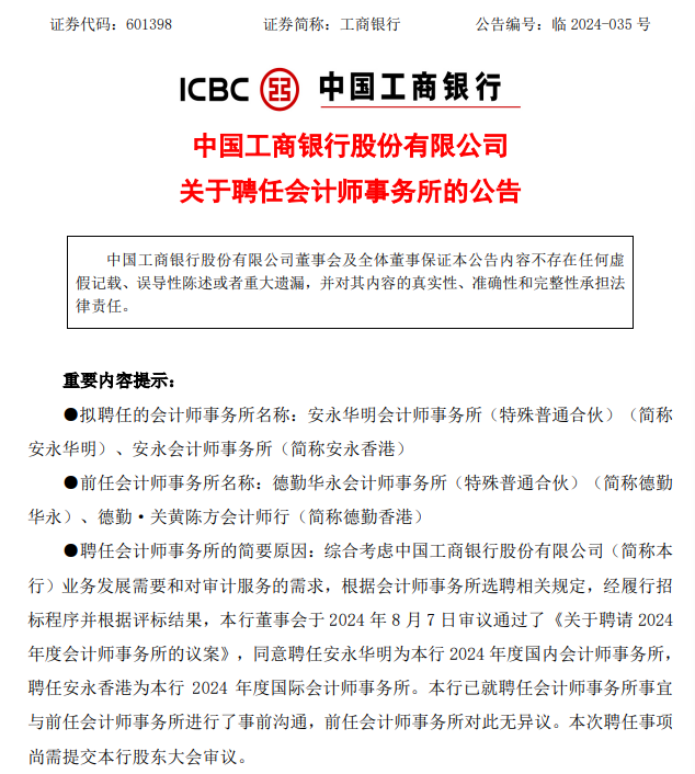 东方资讯消息,中国工商银行股份有限公司发布公告称,综合考虑本行业务发展需要和对审计服务的需求,根据会计师事务所选聘相关规定,经履行招标程序并根据评标结果,本行董事会于2024年8月7日审议通过了《关于聘请2024年度会计师事务所的议案》,同意聘任安永华明为本行2024年度国内会计师事务所,聘任安永香港为本行2024年度国际会计师事务所。