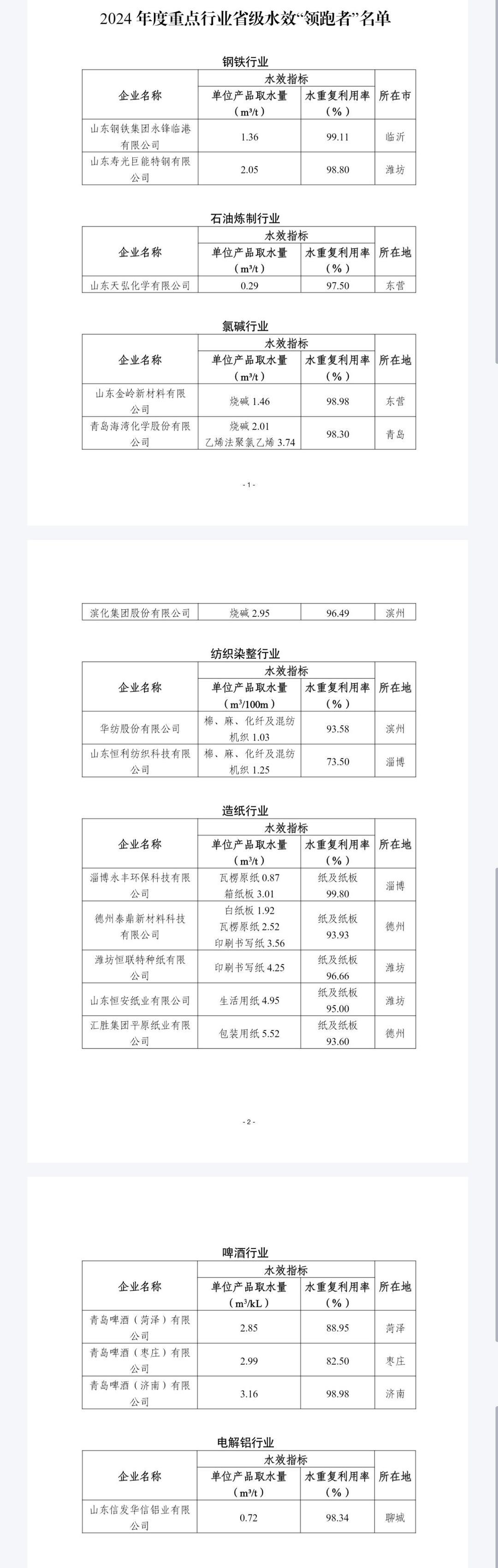 山东省工业和信息化厅日前联合省水利厅、省发展改革委、省市场监管局组织开展了2024年度重点行业省级水效“领跑者”遴选工作,遴选出17家具备引领示范和典型带动效应的水效“领跑者”企业。水效“领跑者”称号自发布之日起有效期2年。