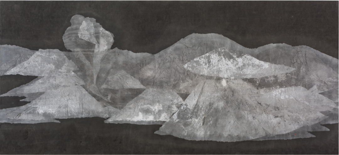 在这组作品中,安晓彤同样使用了非传统水墨的手法。考虑到平面所有呈现出自然景观的山水都是一层一层的叠加状态,她采用拼贴的方法,让每一层宣纸都好似一层山水的肌理。在这里,强调的是纸和墨,用这种解构的方式来呈现山水图式。