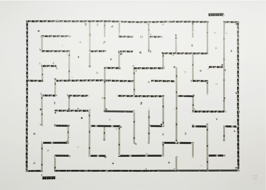 艺术理论家藏策表示,我们身处的世界,就像是一个无尽的迷宫,我们的人生就犹如在迷宫里的一次漫游。芸芸众生固然也会像困在迷宫中的小白鼠一样徒劳往返,但人又不同于小白鼠,人毕竟有语言有概念具有反思和推理的能力,故而可以在身在迷宫之中的视角之外,再建构一个反观迷宫的高维度视角,就如卫星定位所显现的视角。安晓彤的“迷宫”系列作品所呈现的,就是这样的一种视角。不过艺术家在这样一种宛如上帝视角的反观中,却并未真的居高临下,让人感觉“高处不胜寒”,而是以一种少女式的情怀,在迷宫的节点处贴上不同形象的贴纸,充满着活泼的童趣。这让我想到了胡塞尔所强调的“生活世界”,所有的高维世界,其实都是以“生活世界”为奠基的。