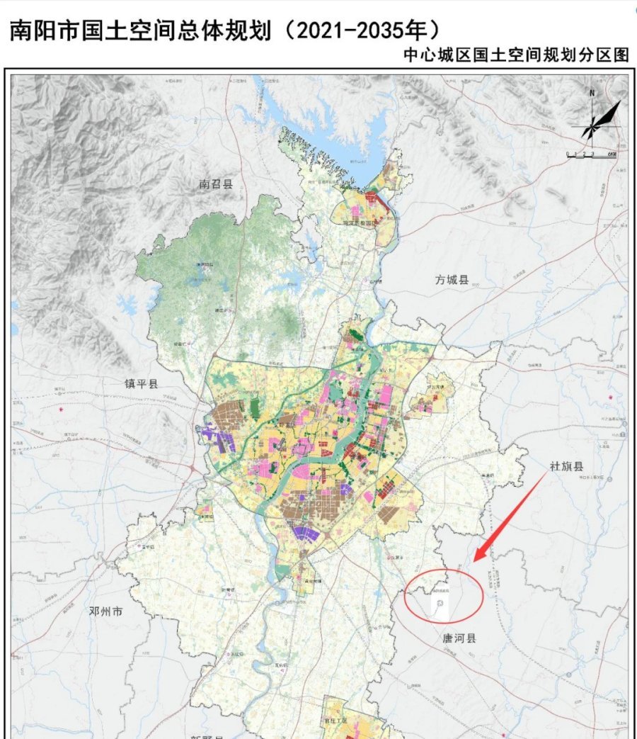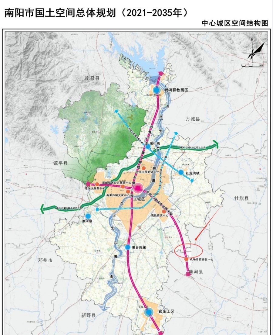 在南阳市国土空间总体规划(2021-2035年)中心城区空间结构图、南阳市国土空间总体规划(2021-2035年)中心城区国土空间规划分区图中,分别标注了新机场的具体位置。