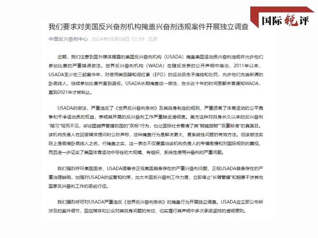 这些表态和呼声,坐实了美国体育运动中存在大规模、有组织、系统性使用兴奋剂的严重问题,也说明国际社会看清:美方为保住所谓“优势地位”贼喊捉贼,无所不用其极。