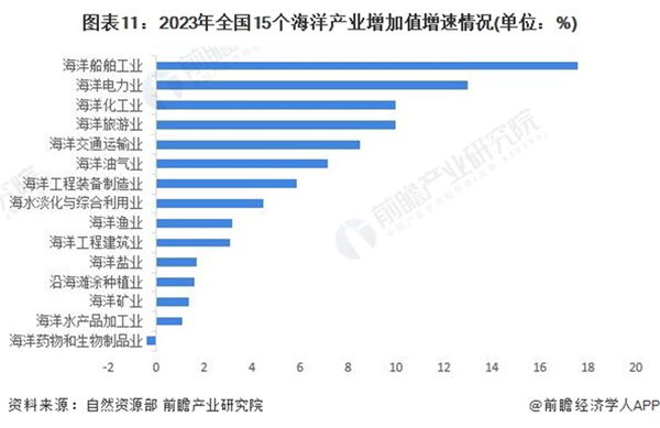 经初步核算,2023年15个海洋产业中,海洋旅游业增加值和海洋交通运输业增加值占比大,分别为36%和19%;海洋药物和生物制品业、海洋水产品加工业增速最快,分别为17.6%和13%。