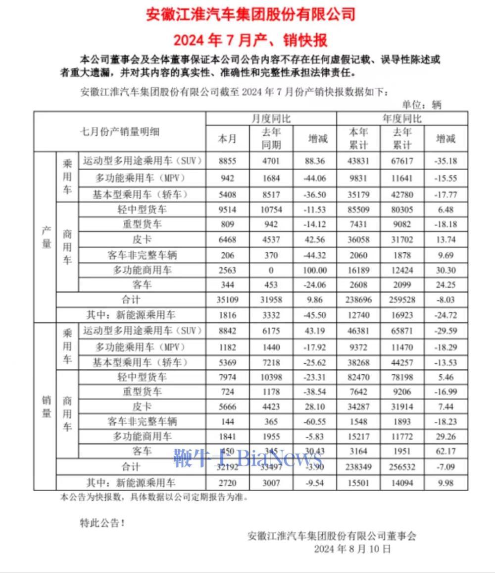 鞭牛士 8月9日消息,江淮汽车今日发布7月产销快报,2024年7月公司总产量为35109辆,同比增长9.86%,其中新能源车产量为1816辆,同比下降45.5%。1-7月公司累计产量为238696辆,同比下降8.03%。