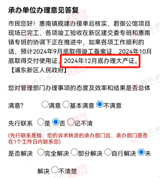 按照合同约定,项目首批交付日期为2022年9月,目前已延期两年,官方最新答复称,预计“2024年12月底办理大产证”。