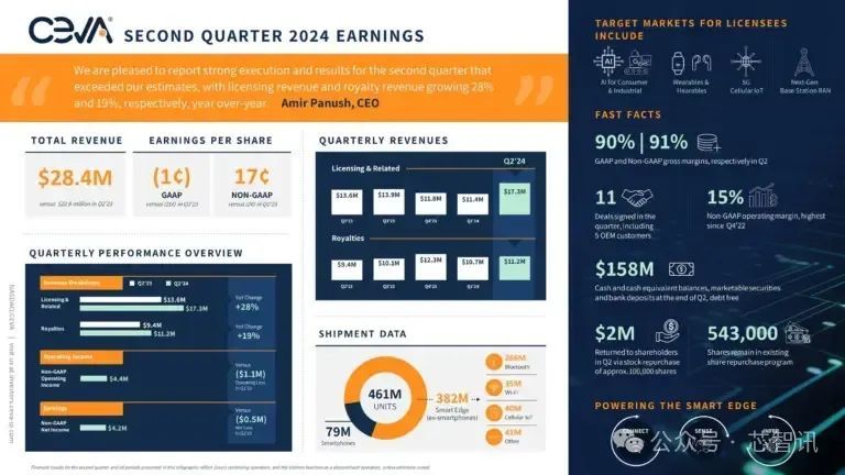 Ceva在第二季度的许可和相关收入为1730万美元,同比增长28%;特许权使用费收入为1120万美元,同比增长19%。