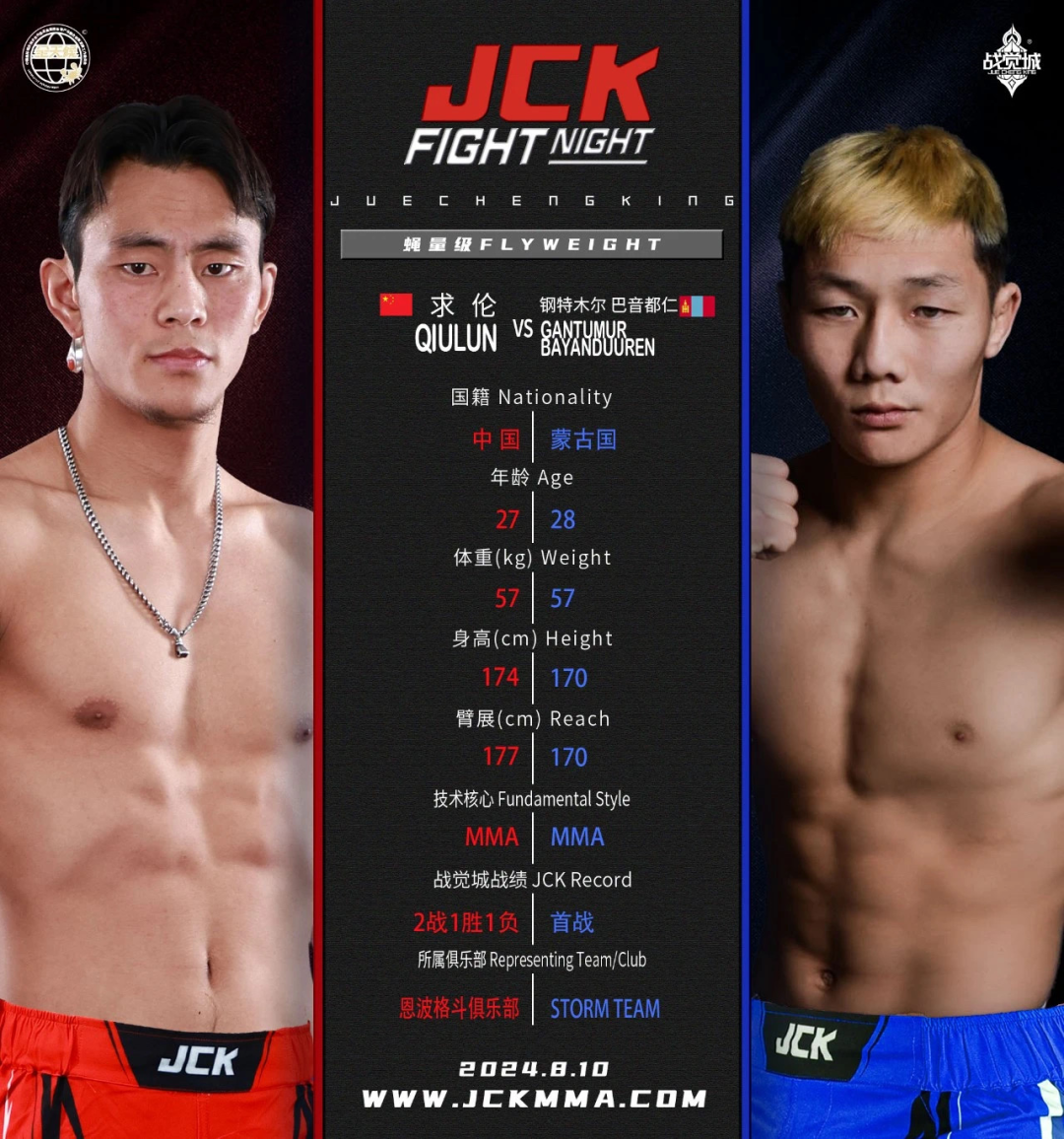 北京时间8月10日晚7点,JCK战觉城觉城之夜N90即将火热开打。头条主赛将由一场中蒙对抗领衔,求伦迎战来势汹汹的蒙古国选手钢特木尔巴音都仁。联合主赛中,终结高手吉木五沙将与新星马烨一较高下。