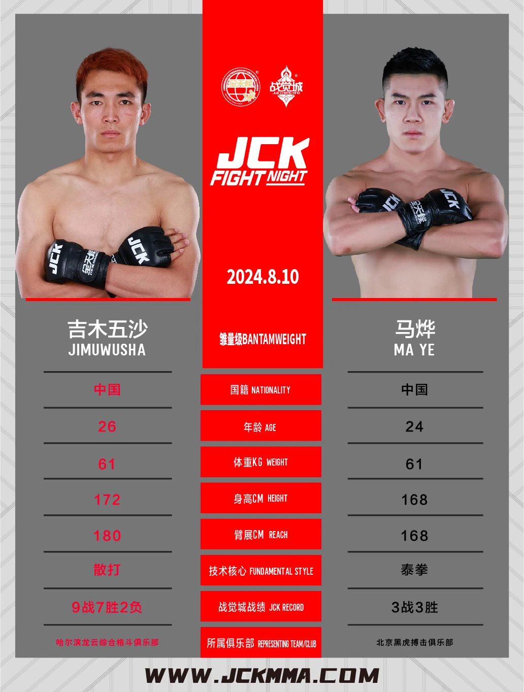 此次迎战新星马烨,对方职业生涯8战8胜未尝败绩,并且目前在JCK战觉城3战3胜,先后击败了叶尔波勒和阿卜杜拉·达依木两位悍将,并且在JCK战觉城哈萨克斯坦站的比赛中战胜了吉尔吉斯斯坦不败高手谢米克·萨尔巴绍夫。